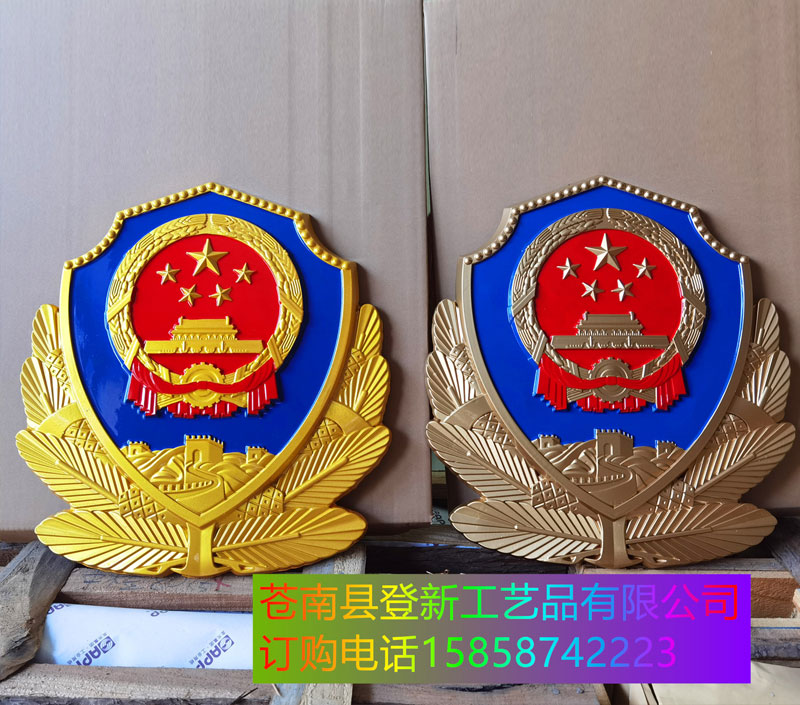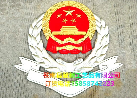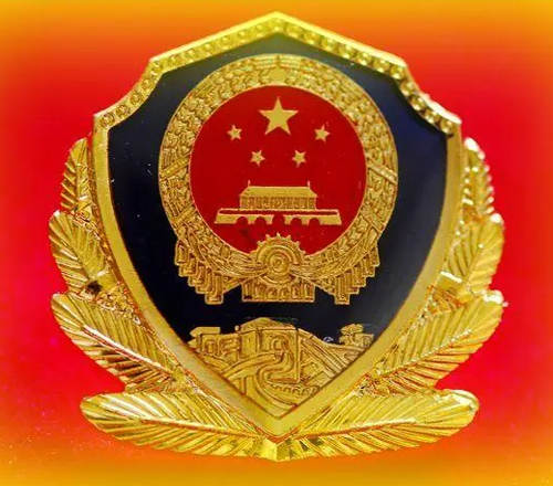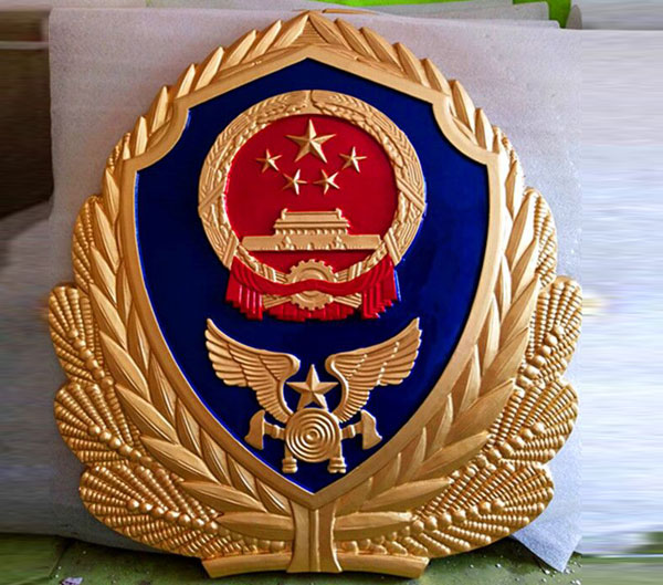 鈦合金材料制作出的警徽。普通常用材質(zhì)為ZL102鑄造鋁合金高溫精練浸透壓延鑄造,采用汽車(chē)烤漆房高光澤靜電均布式噴烤漆技術(shù)和我國(guó)傳統(tǒng)黃金金箔貼金工藝;再加進(jìn)口透明耐候保護(hù)